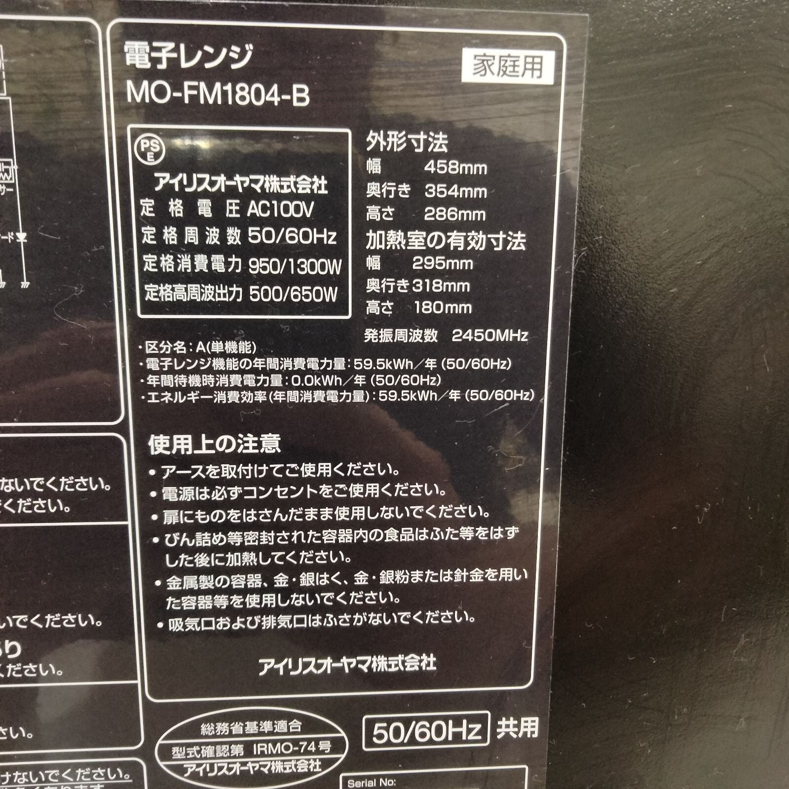 アイリスオーヤマ 20年製 電子レンジ MO-FM1804-B