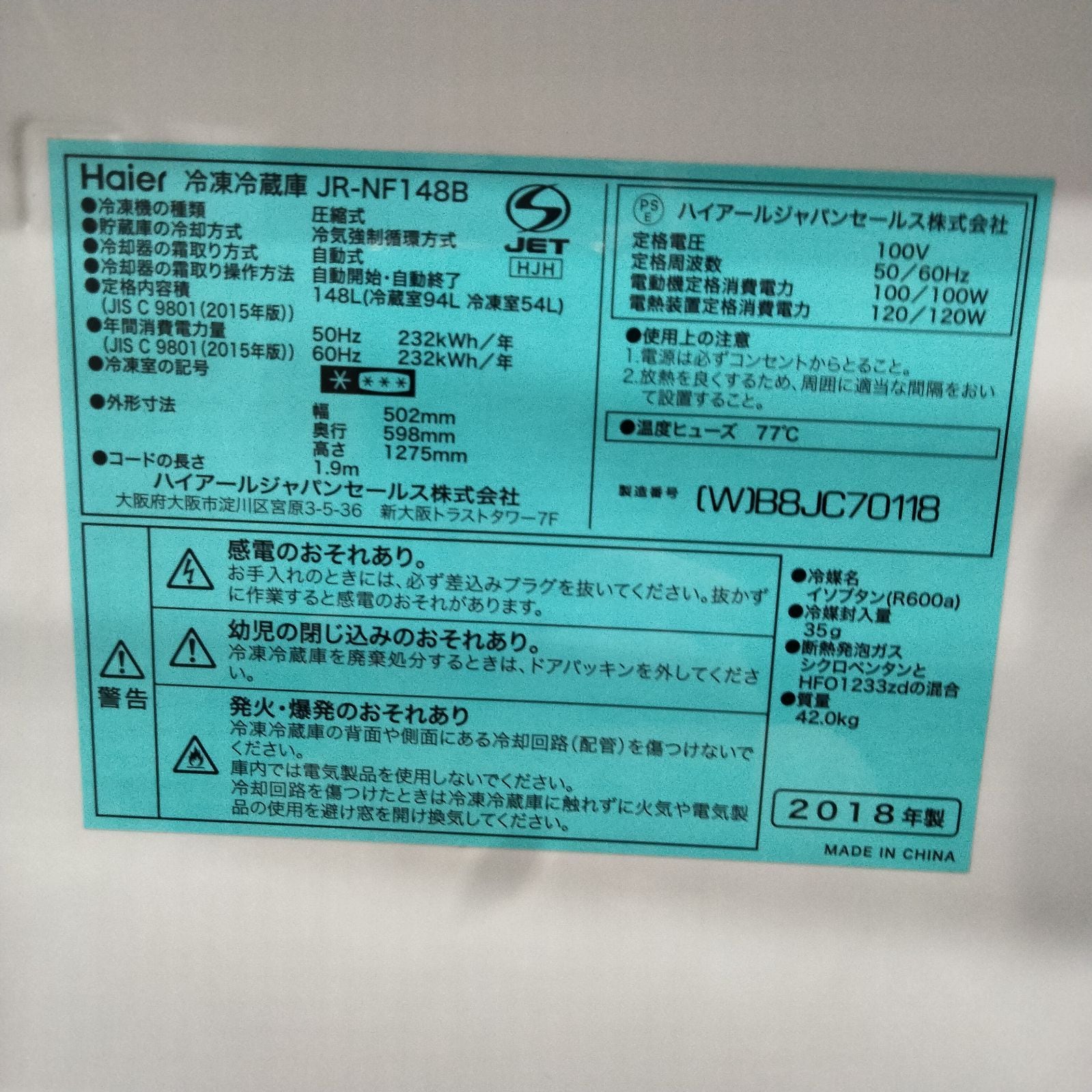 Haier 冷凍冷蔵庫 JR-NF148B