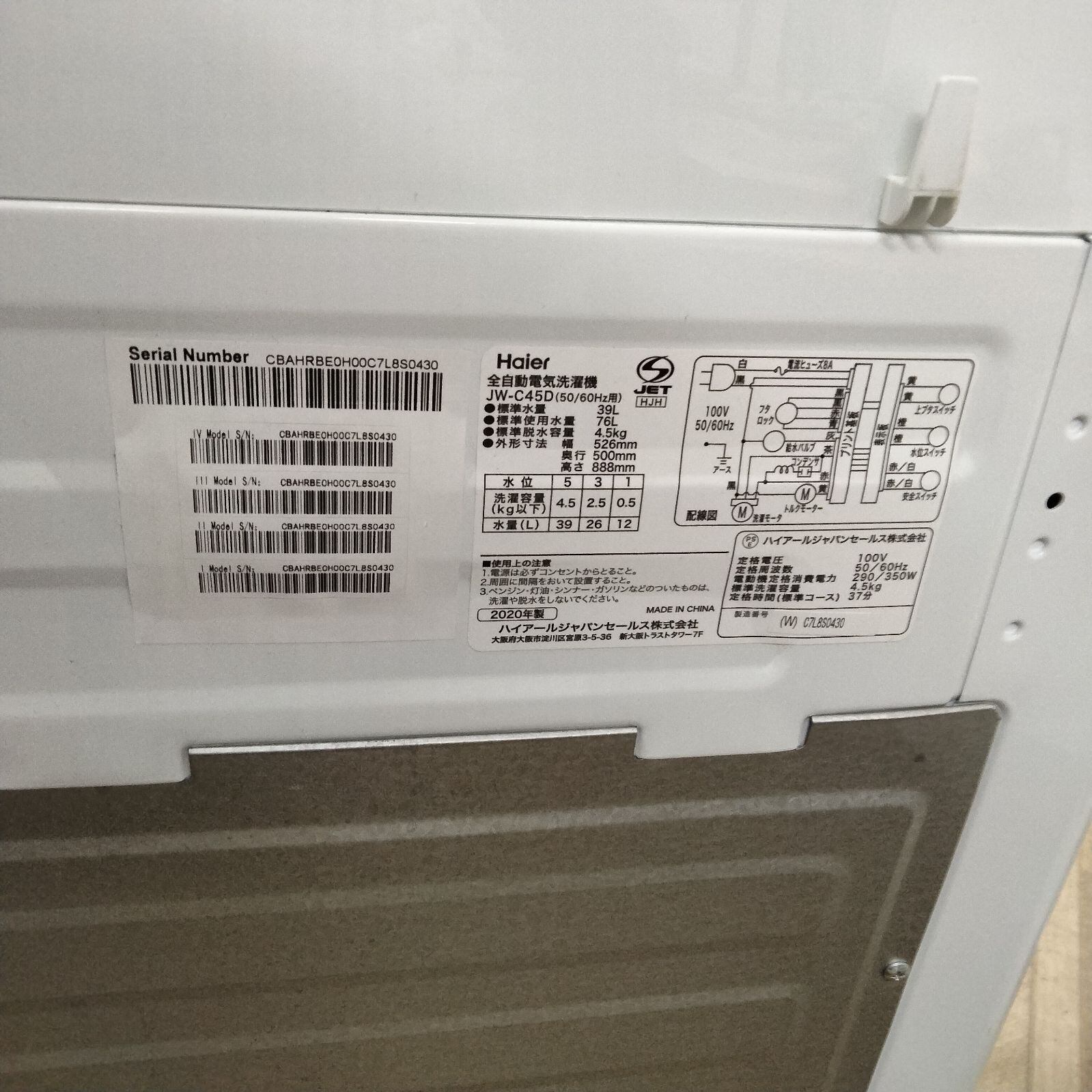 ハイアール製 2020年製 5.5kg 全自動洗濯機 JW-C55D