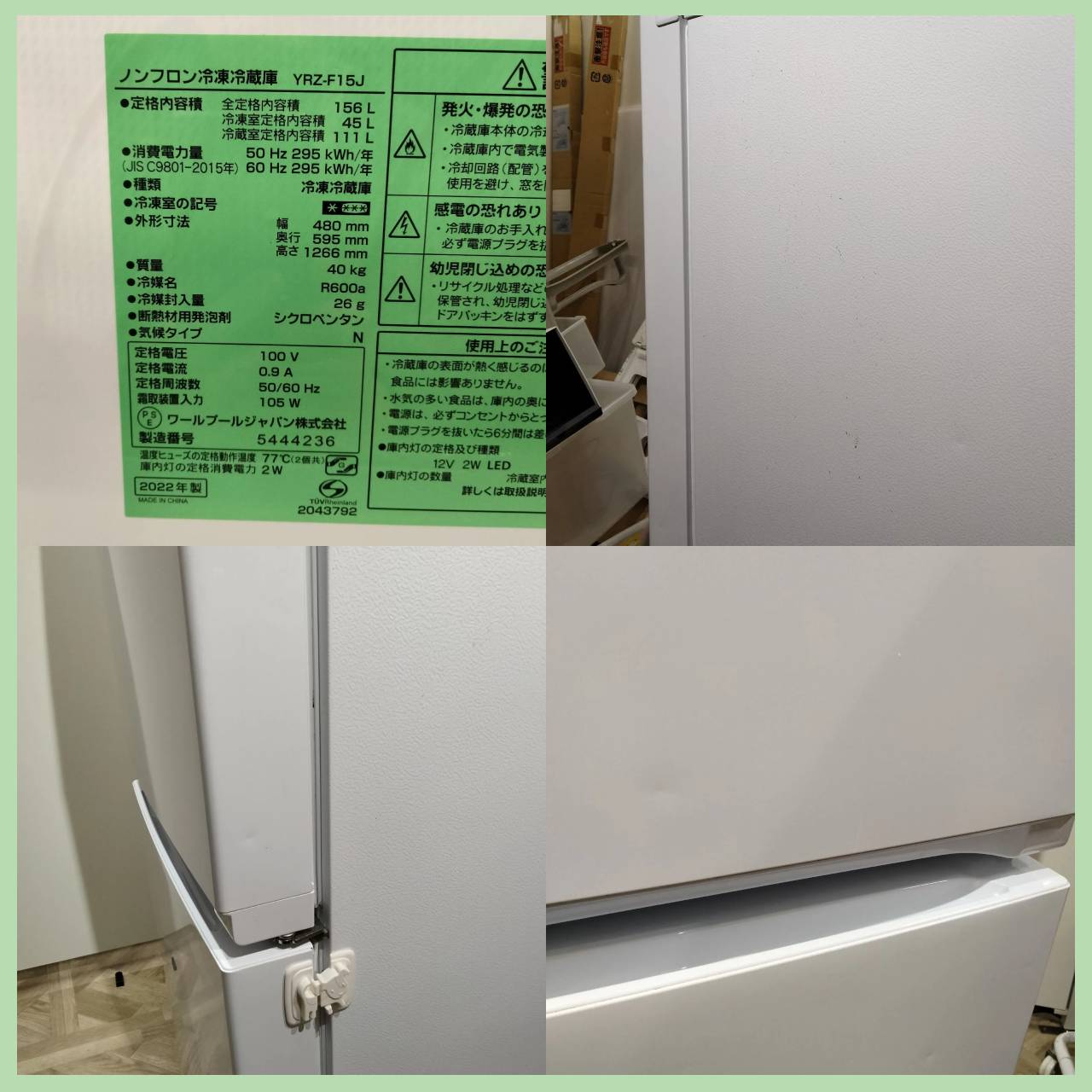 ワールプールジャパン yselect ノンフロン冷凍冷蔵庫 2022年製 YRZ-F15J