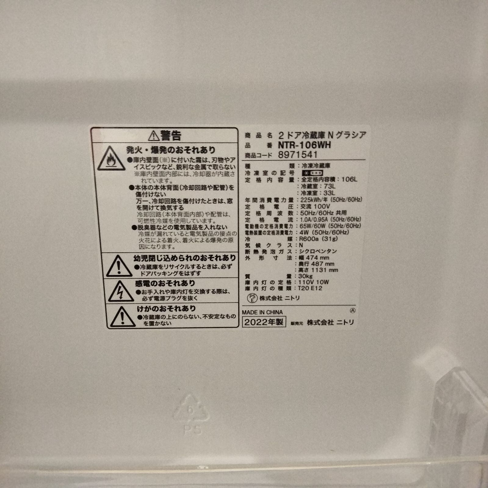 ニトリ 2ドア冷蔵庫 106L 2022年製 Nグラシア NTR-106WH