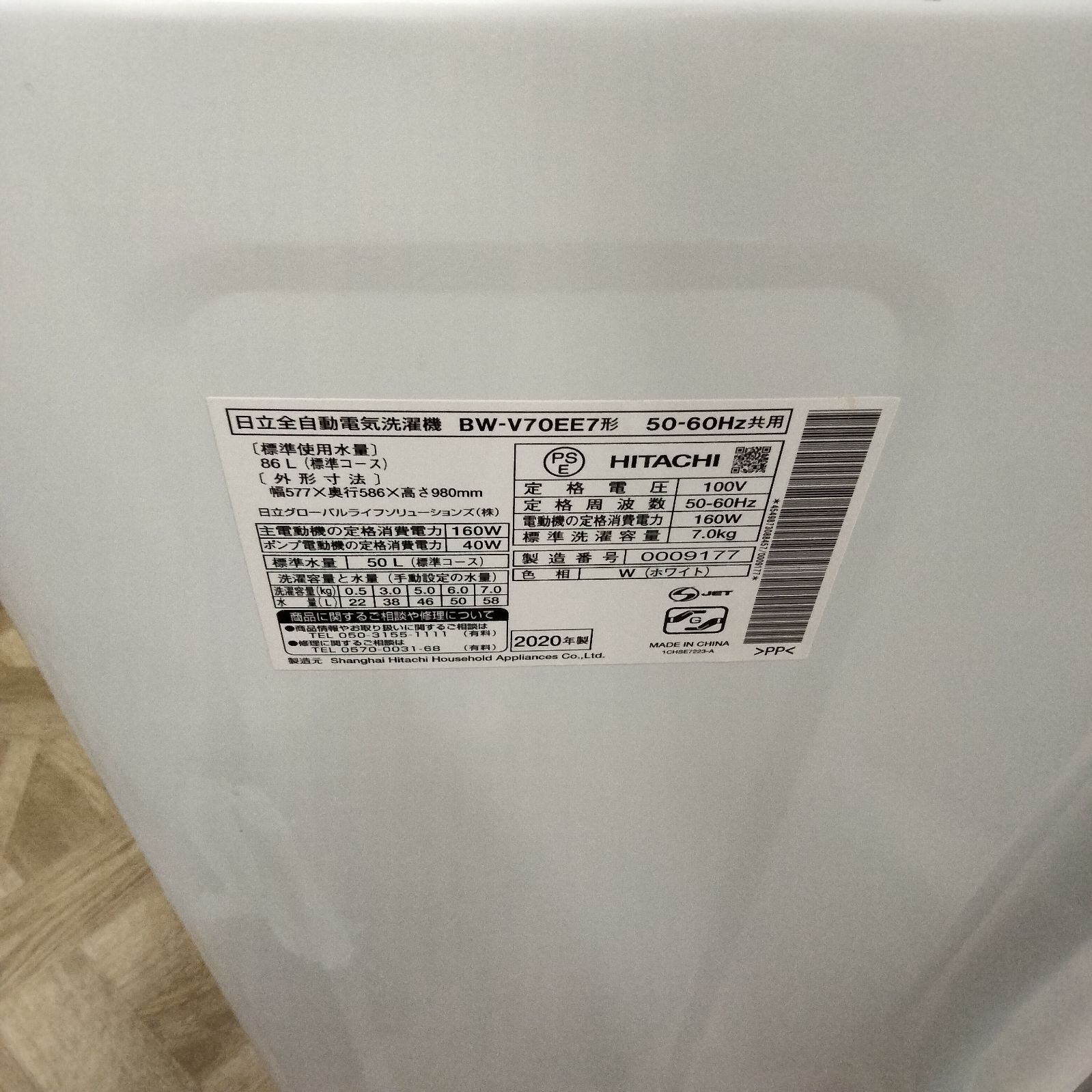 日立 20年製 全自動電気洗濯機 7kg BW-V70EE7